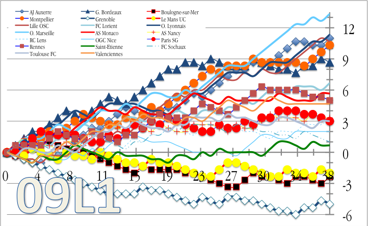 About: Charts in this page show "Games behind(GB)". GB is popuar score in baseball leagues and it helps to grasp the distance or the gap in league standings. e.g. 1GB means that it needs 1 game to catch up: 3pts distance is 1GB.Based on this tool, I created this chart to comprehend momentum with making winning team moving upwards and loosing downward, draw for flat. Enjoy!