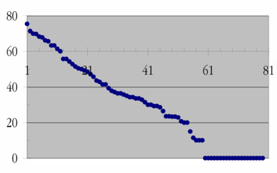 履修登録146名と過去最多クラス。うち期末試験受験者113名(無記名1名)で単位取得27名。単位取得率は名目で18%、実質で24%(名目は全履修登録者を母数とする取得率、後者は受験者のみ)。ただしほぼ白紙の0点を除く実質的な受験者は71名なのでこれを母数とすると取得率は38%。さらに、講義中に時折実施した小テスト(試験得点のブーストに利用)を一回も受験していない学生が期末試験受験者の中に29名おり、これを除くと再狭義の実質受験者は42名でこれを母数とする取得率は64%になる。担当者としては、この最も狭義の受験者に対する取得率で見て難関化していればそれは申し訳ないと思うのだが、その懺悔はしなくてよいようだ▼さらに言えば、逆に0点続出の答案を見慣れてしまったせいで、逆にまっとうな答案には若干採点が甘くなった可能性すらある。担当者は滅多に満点は出さないが、今回はそれが出た。特に名前は伏せるが1年生山本さん、おめでとうございます。90点以上も計3名と立派なものだ▼前述の小テストによるブーストの効果について言えば、これによって60点台が70点台になった学生さんが14名、60点以下が60点台になった学生さんも6名出た。これだけゲタを履かせても58点、57点と60点にほんのわずかにとどかない学生さんというのも存在するが、可能な限りのブーストをした結果なので、申し訳ないが救済はしない。