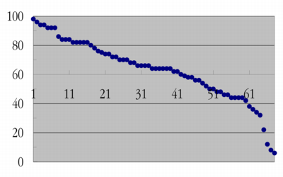 図はあくまでも素点の分布である。期末試験受験者68名、60点以上42名(61%)。あくまでも素点の分布であるが、A/B/C/Dの分散も順当と思われる。が、約束通り、最終評語の決定には講義時間内に実施した Minute paper の成績による加算を実施する。これで私の2年間のK非常勤も終わりです(の筈)。ありがとうございました。