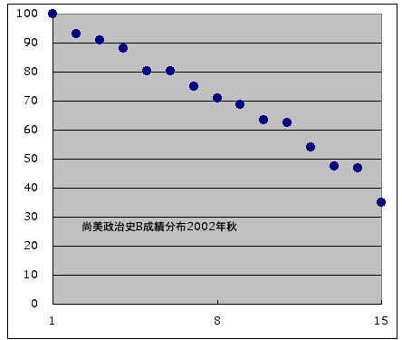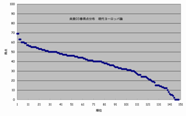 試験のみを含む1回以上の出席者(評価対象)15名、平均点は70。評価では、90点以上の「秀」3名(20%)、80点以上の「優」3名(20%)、70点以上の「良」2名(13%)、60点以上の「可」3名(20%)で単位取得者は11名(73.3%)。(カッコ内は評価対象者に占める割合)。少人数であったためか、単位取得率は極めて高くなっています。出席、中間、期末を通じて満点が一名います。石橋君、おめでとう。今後この科目に挑戦する方はわからないことは石橋君に聞いてみるのもいいかも知れません。あれ?石橋君は現代ヨーロッパ論も「秀」ですな。