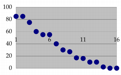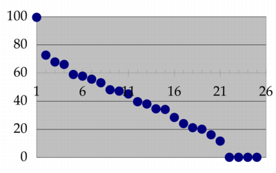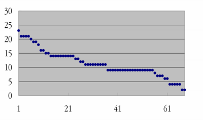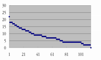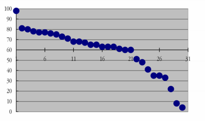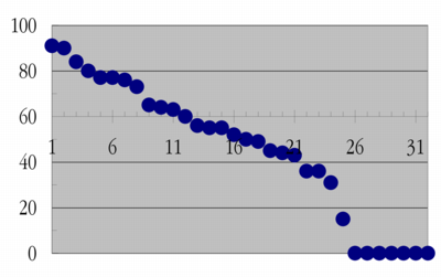 最終的な得点分布は下のグラフの通りとなっています。縦軸に試験成績、横軸に順位をとってあります。登録総数62名、試験のみを含む1回以上の出席者(評価対象)62名、平均点は48。評価では、90点以上の「秀」2名(3.2%)、80点以上の「優」4名(6.5%)、70点以上の「良」12名(19.4%)、60点以上の「可」9名(14.5%)で単位取得者の割合は27名(43.5%)。(カッコ内は評価対象者に占める割合)。出席回数が1回以下の履修放棄と見なされる人数は8名であるので、これを差し引いた実単位取得率は50%。中間試験を受けないで最終試験のみ来た者が13名、うち1名はそれまで1回も出席せずに期末試験だけ受験した人ですね。しかし中間試験未受験でもその他の出席状況や期末レポートが優秀であったために最終的に単位を取得した者が2名います。ちなみに、今回単位取得者の中で最も出席の少ないのは6回でした。落第者の中には残念ながら11回出席してくれた人も含まれています。このような落第がでたのは、期末レポートに不正が多く見られたためです。文献やWWWなどからの丸写しである「クロ」のレポートが確認しただけで8名ありました。この他、そのレポートが認められても最終成績が合格ラインに達しないため、厳密に検証しなかった「灰色」のレポートはさらに多数あります。教員は、毎日毎日関連文献を読み返しているのですから、丸写しはすぐにわかるので無駄な努力はやめたほうが賢明と思われます。ちなみに、丸写しはもちろんゼロ点です。本来はその上で不正行為としてなんらかのペナルティが課せられるべきものと思われますが、今回は見送っておきます。だいたいの引き写し元の見当は付いていても最終的に確定するために厳密な照合を行うので、教員の負担は大変大きく、また、採点作業の遅延により事務にご迷惑をおかけすることとなるので、学生諸君は態度を改めて下さい。