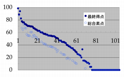 履修登録105名のうち単位取得26名(25%)。しかし30名は0点で(実質)放棄なのでこれを除くと母数は75名になり、単位取得率は35%。QUIZ実施以前と変わらないな。ちなみに、白抜きの水色が中間と期末両試験の得点(素点)で、青マルがQUIZ成績加算後である。おおむね順当にブーストがかかっている。これにより単位を「拾った」(素点で60点未満であったものが修正されて60点を超えた)のは12名。QUIZの成績は加算材料としてのみ利用しているので、その逆はない。