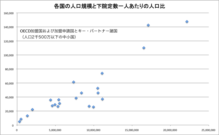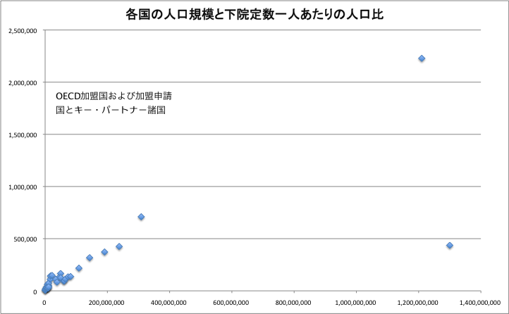 日本の議会について、議員定数削減の議論がある。アメリカに比べて多すぎるとか、ヨーロッパに比べて少なすぎる(あるいは適正である)などの意見が見られるが、そもそも、議員一人あたりの人口というのは、各国の人口規模によるところがあるのではないかと思っていた。どんなに国の人口規模が小さくとも、一定数の議員は必要になるだろうと考えられる一方で、その基準をそのまま人口数億の大国に当てはめれば途方も無い議員数となるだろうことも自明だからだ。